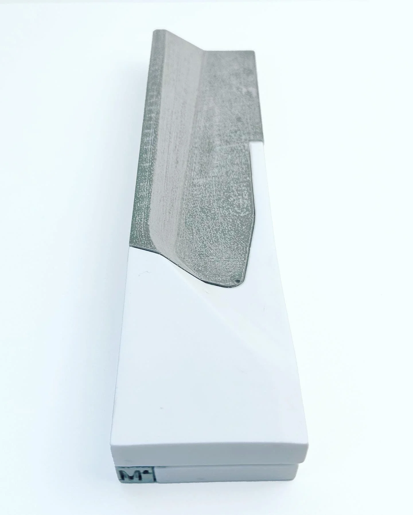 A detailed and contemporary incense holder. This long piece is handmade from concrete and PLA. PLA, is a thermoplastic monomer derived from renewable, organic sources such as corn starch or sugar cane. Using biomass resources makes PLA production different from most plastics, which are produced using fossil fuels through the distillation and polymerization of petroleum.