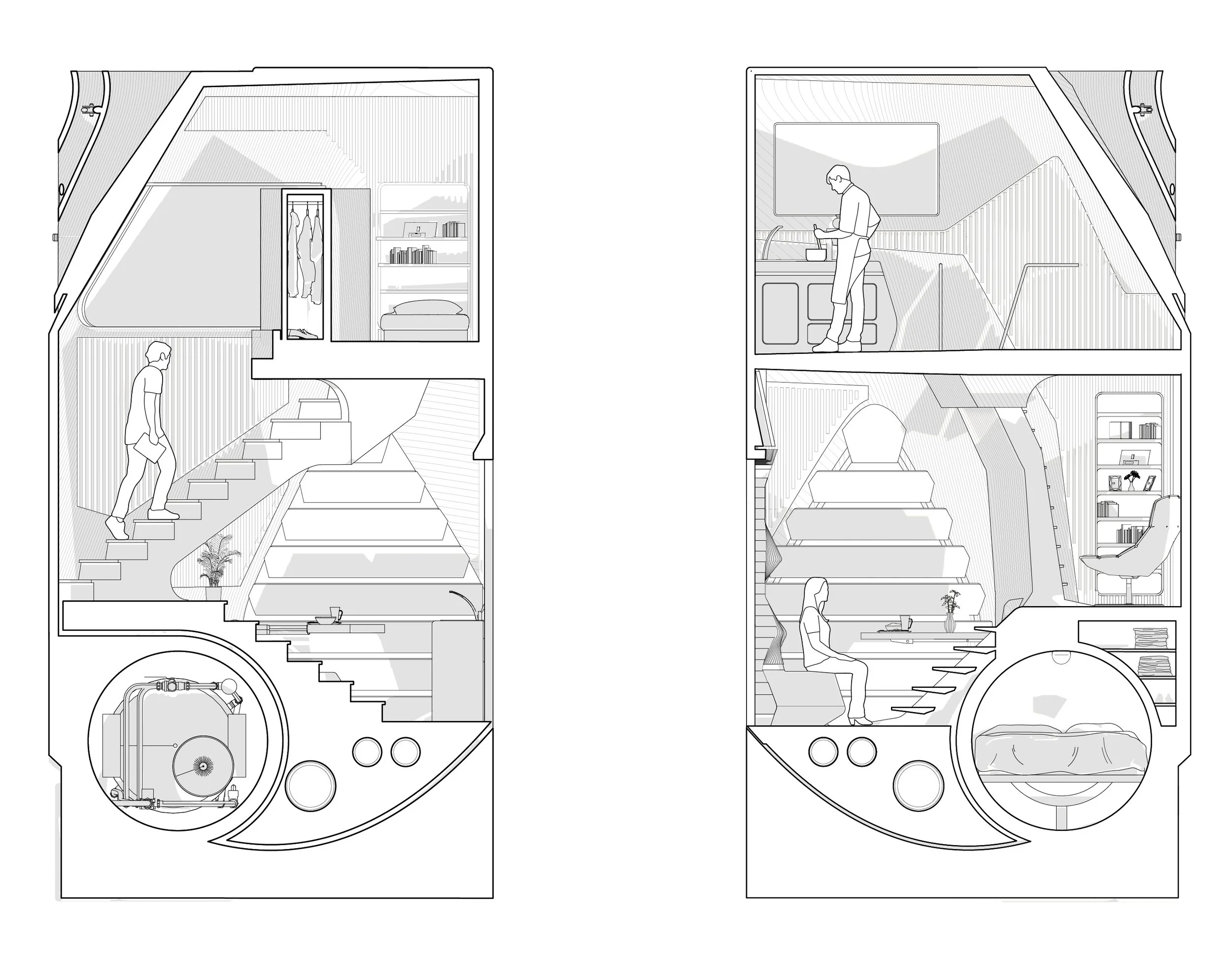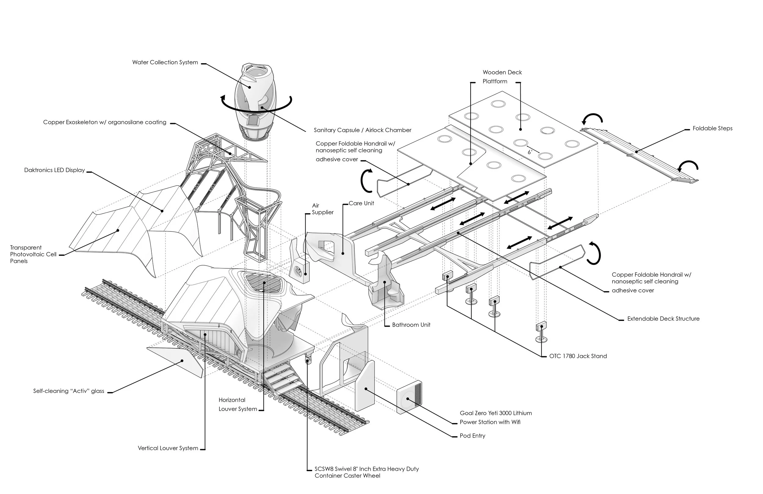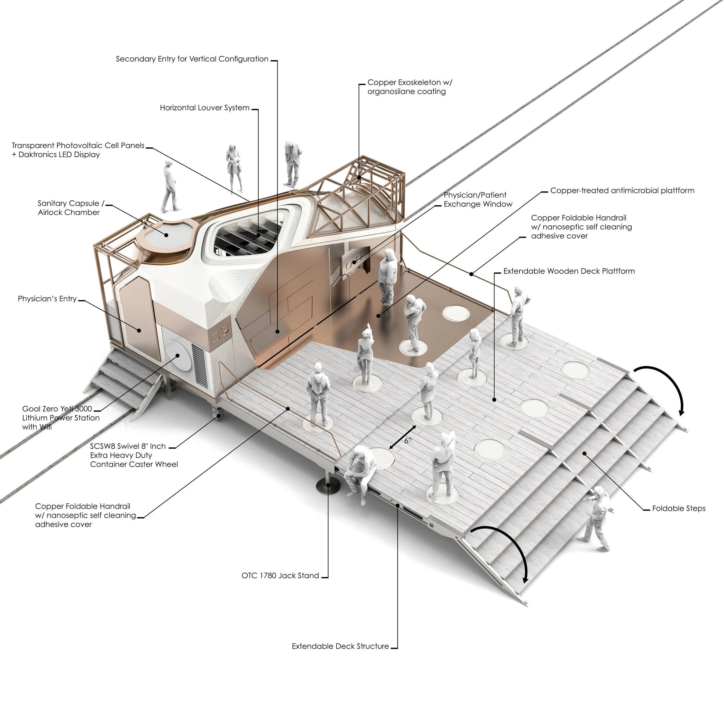 When Covid-19 cases have diminished and a vaccination is available, the Personal Protective Pod will serve a new purpose with an entirely new set of parts: an affordable housing unit. The kit of parts used to create the interior of the testing station will be removed, and a new kit of parts will be introduced in order to maximize the opportunities available when the Pod becomes vertical.